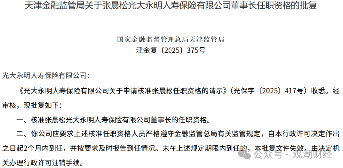 2024年8月30日,监管批复核准张晨松光大永明人寿总经理和董事的任职资格,直至近日其获批担任董事长一职。