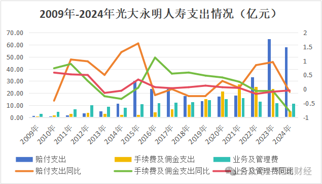 与上述2指标变化不同,光大永明人寿赔付支出波动较大。近五年来,除2024年外,2020年-2023年分别同比上升28.53%、4.16%、84.83%、95.69%。截至2024年末,该公司赔付支出为58.25亿元,同比下降10.24%。