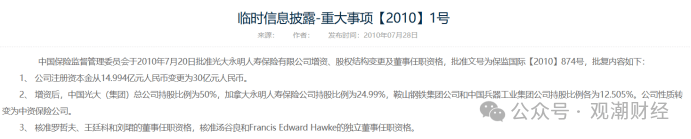 在该公司成立的前7年,日常经营管理多以外方股东为主。但经营管理问题在几乎所有合资险企中都明显体现出来,之后便出现了一波险企股权变更潮。2010年7月,光大永明人寿增资扩股和变更股权结构的申请获原保监会批准,通过股东不同比例追加投资并引进战略投资者的方式完成了股权结构变更,正式转变为中资保险公司。