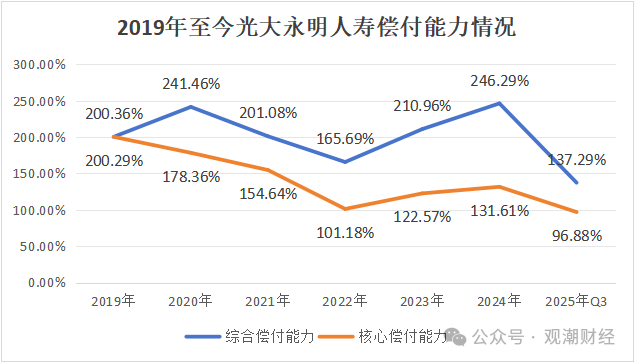 从偿付能力来看,近6年,光大永明人寿综合、核心偿付能力均处于较高水平。截至今年Q3,该公司综合、核心偿付能力有所下降,分别为137.29%、96.88%。对此,该公司偿付能力报告解释称,主要系净资产减少。