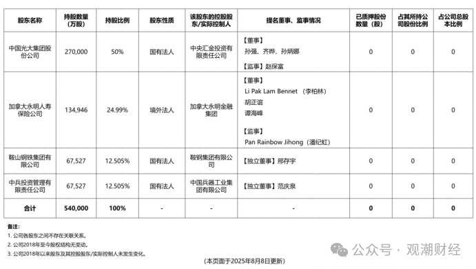 此后,该公司经营上完全由中方主导。从股权架构来看,中国光大集团对其持股50%,成为控股股东;加拿大永明人寿持股比例降至24.99%,位列第二大股东;新引进的中国兵器工业集团和鞍山钢铁集团作为战略投资者,各持有12.505%股份。
