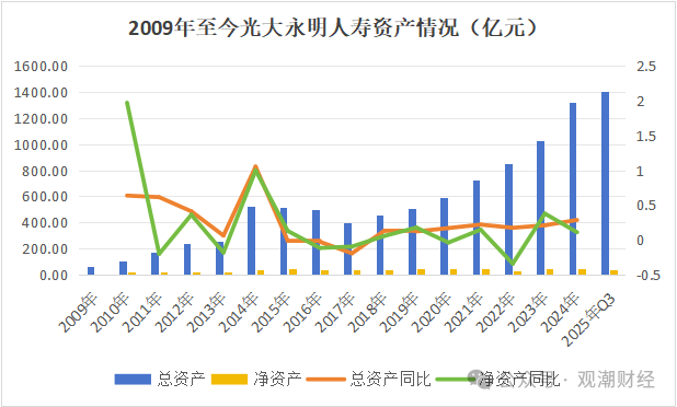 从资产端来看,光大永明人寿总资产整体呈现上升态势。除2015年-2017年连续微降至401.60亿元外,其余年份总资产连续上升,2023年首次突破千亿规模。截至今年Q3,该公司总资产达1408.87亿元。相比之下,净资产在过去年间略有所波动。