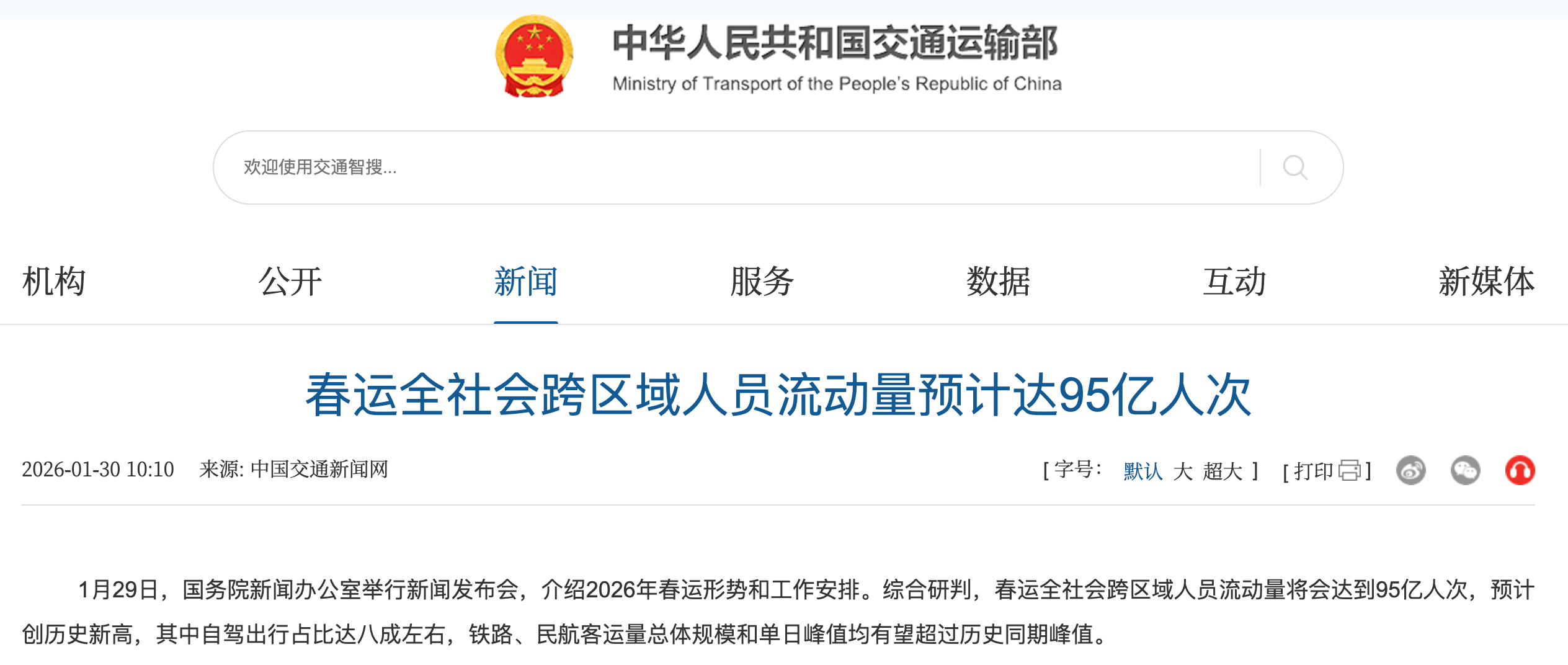 图注:交通运输部综合研判,春运全社会跨区域人员流动量将会达到95亿人次